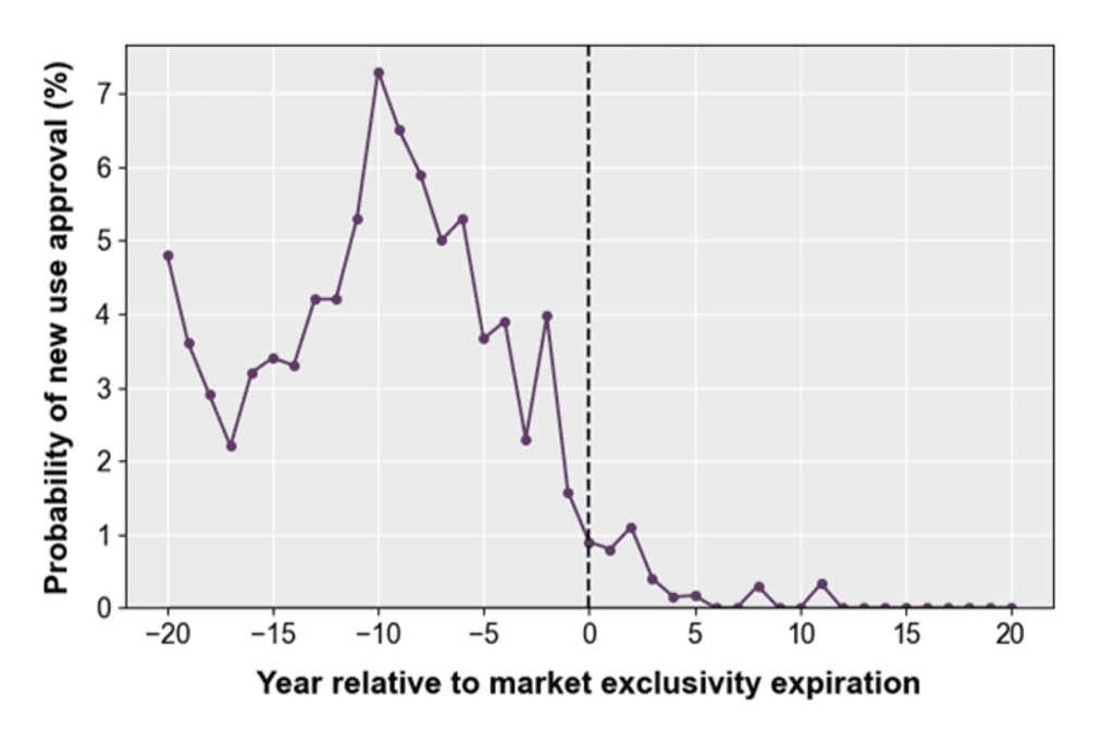Figure 1. The probability of approval for new use decreases after market exclusivity expiration