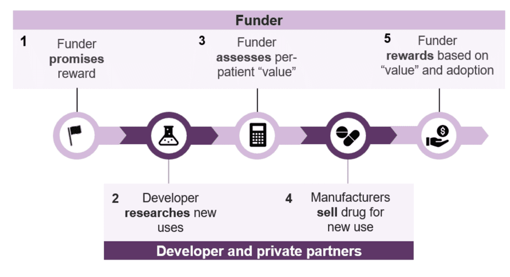 Pull funding could work as follows. First, the funder would commit to reward research sponsors based on the expected health impact of a repurposed drug. Second, in response, researchers would investigate new uses for generic drugs. Third, clinical trial data would then be used to assess impact. Fourth, if successful, manufacturers would bring the drug to market for the new use. Fifth and finally, NIH would reward the entity that generated the evidence (i.e., the trial sponsor), rather than the manufacturer, based on the drug’s measured value and real-world adoption.