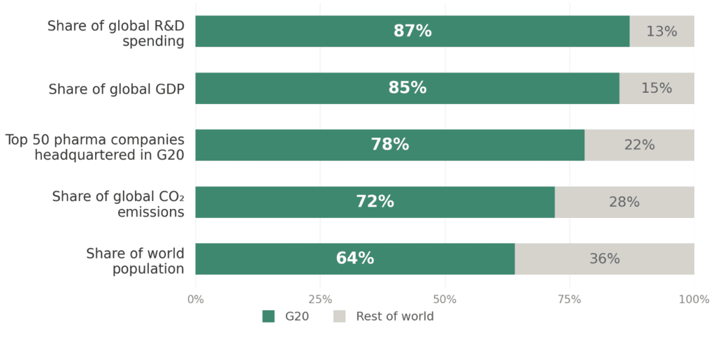 The G20 is especially well placed to make these investments. No single country has a strong incentive to pay for innovations whose benefits spill across borders—a new antibiotic or antiviral benefits everyone, not just the country that funds it. But with 64 percent of the global population, the G20 collectively is large enough to internalize cross-border spillovers from health and climate innovation, making coordinated investment worthwhile. G20 members also account for 87 percent of global R&D spending, 72 percent of CO₂ emissions, and are home to nearly four in five of the world’s top 50 pharmaceutical companies (see Figure 1)—meaning the G20 has both the innovation capacity to develop new solutions and the market weight to pull them to scale. The G20 also represents over 85 percent of global GDP and includes large middle-income countries where much of the growth in demand for health and climate technologies will occur, making it uniquely positioned to act.