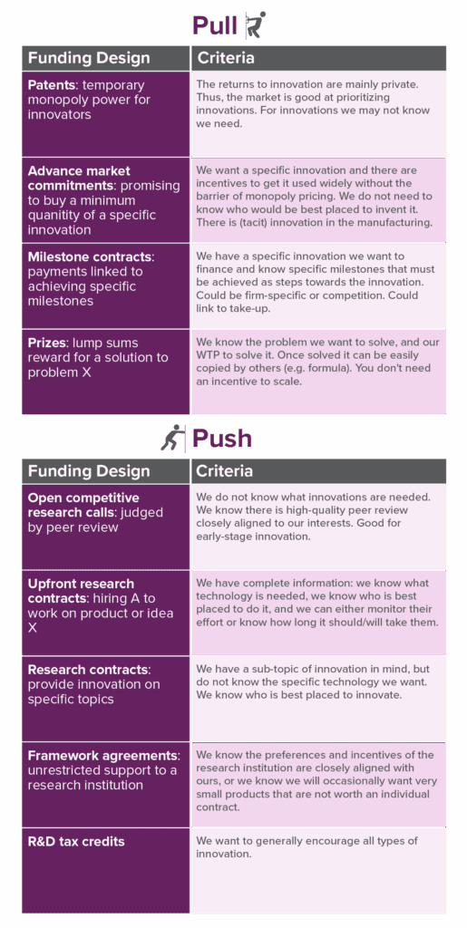 In general, pull mechanisms are useful when we know we need an innovation, but we don’t know who is best placed to develop it or how.